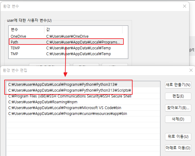 - 설치 경로 확인 (예: C:\Users\user\AppData\Local\Programs\Python\Python313\python.exe)